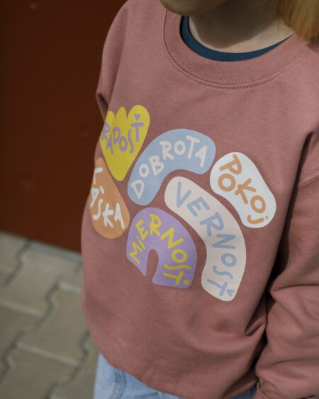 Ružová detská mikina s farebným motívom, ktorý deťom pripomína krásne hodnoty ovocia Ducha.