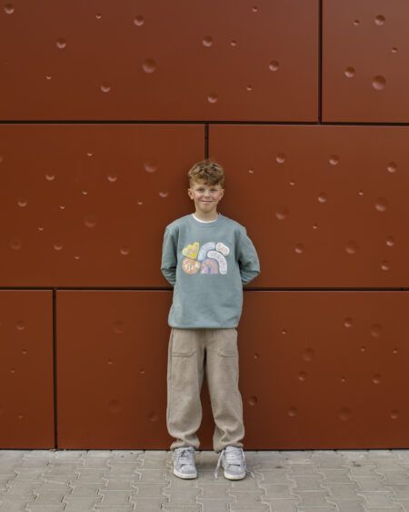 Zelená detská mikina s farebným motívom, ktorý deťom pripomína krásne hodnoty ovocia Ducha.